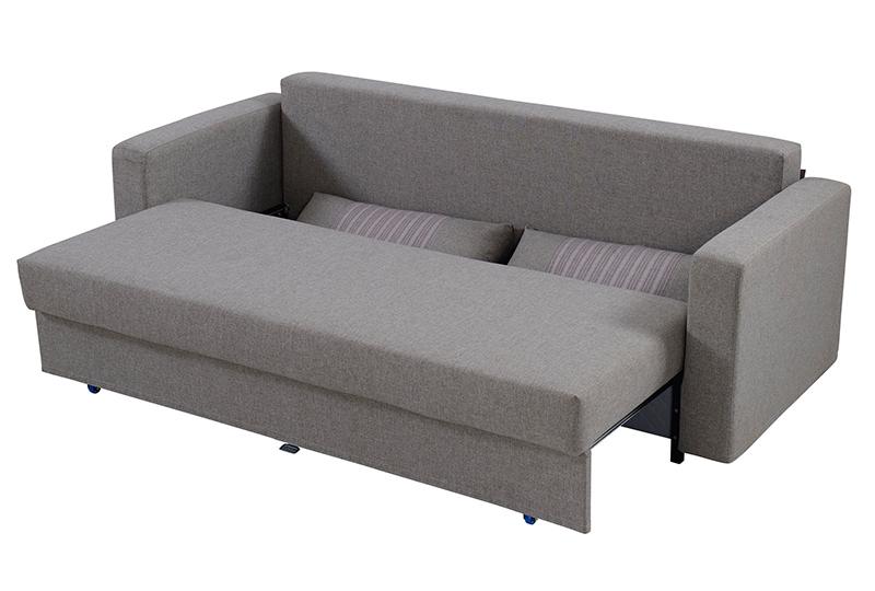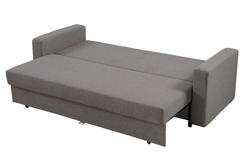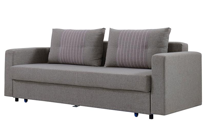 The AD130 3-seat fabric storage sofa bed adopts steel and wood structure, detachable double armrests and storage. If you pull out the seat cushion to the forward when it is still in state of sofa, you can see the storage box under the opened seat cushion. If you pull down the backrest to the forward and cover it on the storage box, this sofa can be transformed into a bed.