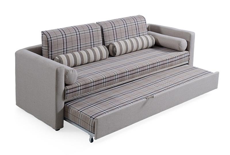 The AD103 living room fabric sofa bed adopts steel and wood internal frame. The armrest and backrest is integrated and surrounding type so that it is quite stable. The backrest has two big and comfortable back cushions and round pillows which can be used to adjust the tilt angle of human back. There is an embedded bed frame under the futon seat cushion. You can pull out and lift the sinking bed surface, thus getting a bed.