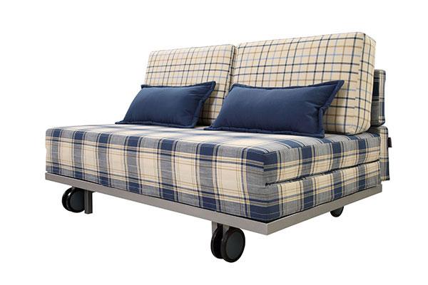 Three different fold out sofa bed specifications are shown in the table below. The foldable underframe is equipped with nylon wheels. To transform the sofa bed into a bed, drag out the underframe, and then pull out the seat cushions and place them on the underframe. The upper layer of the backrest is mobile and can be used as a horizontal shelf if you pull it backward.