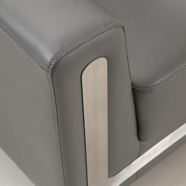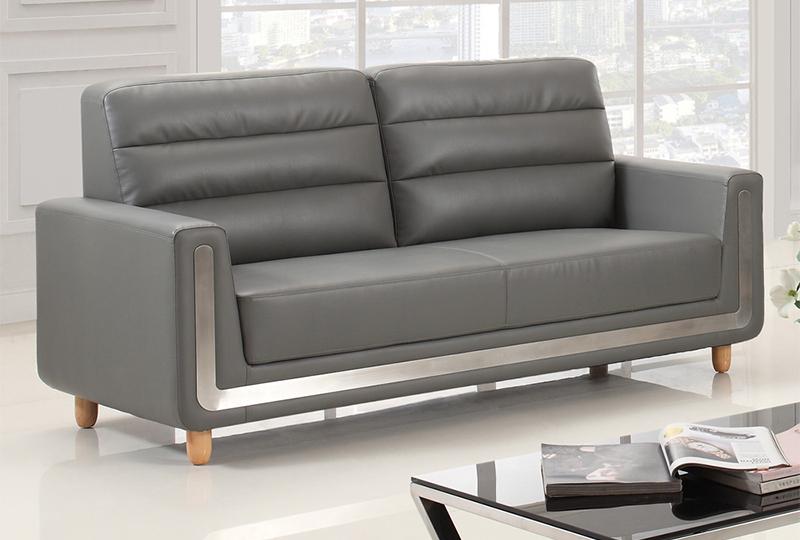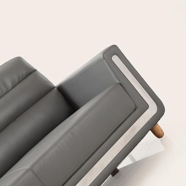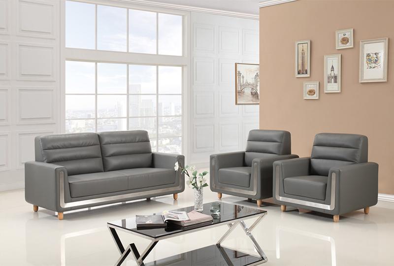 The S346 modern grey leather office sofa has three specifications: one-seat, 2-seat and 3-seat. This sofa adopts gray leather, solid wood internal frame and feet. The armrest and backrest are both trapezoidal. The backrest adopts strips. The sofa is full and comfortable. The front end of the sofa has an embedded stainless steel strip which can connect the armrests of both sides and the bottom frame together.