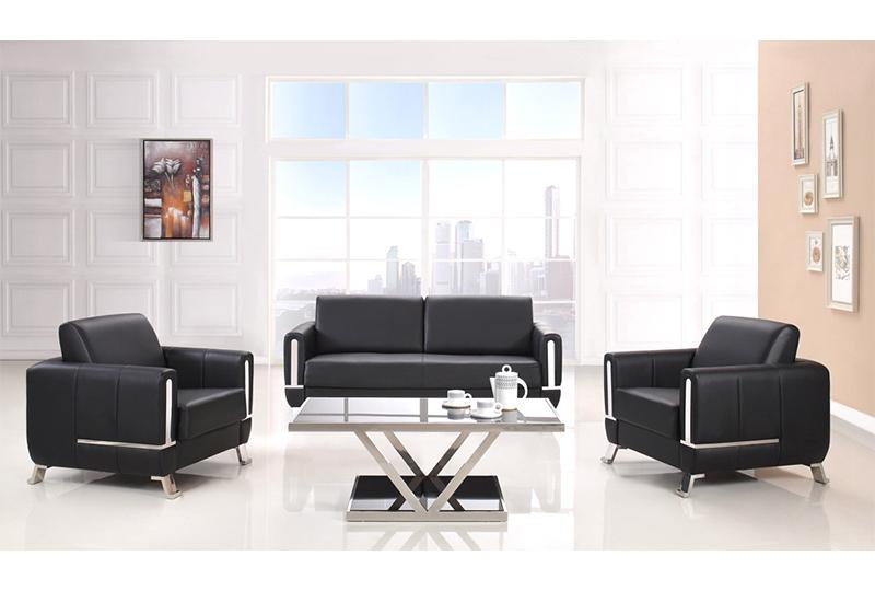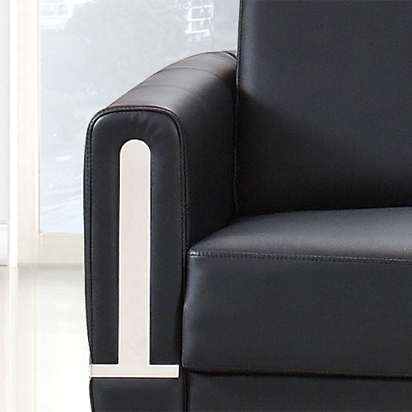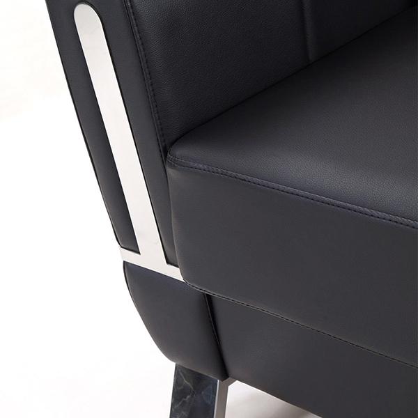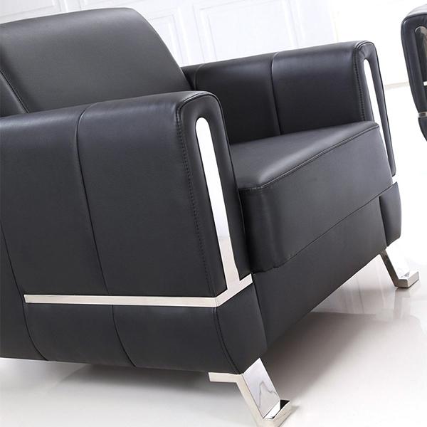The S330 contemporary leather sofa adopts black imitation leather, solid wood internal frame, metal sofa feet and movable back cushion. The two armrests have embedded metal strip. There are three specifications: one-seat, 2-seat and 3-seat.
