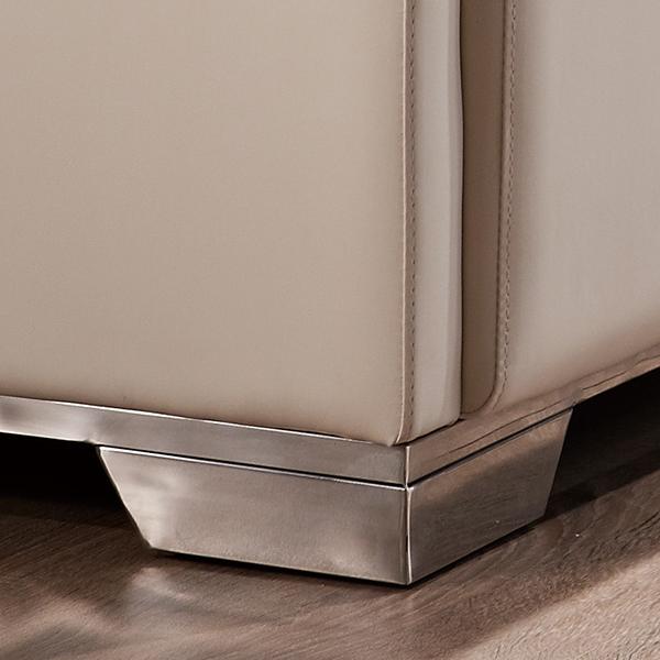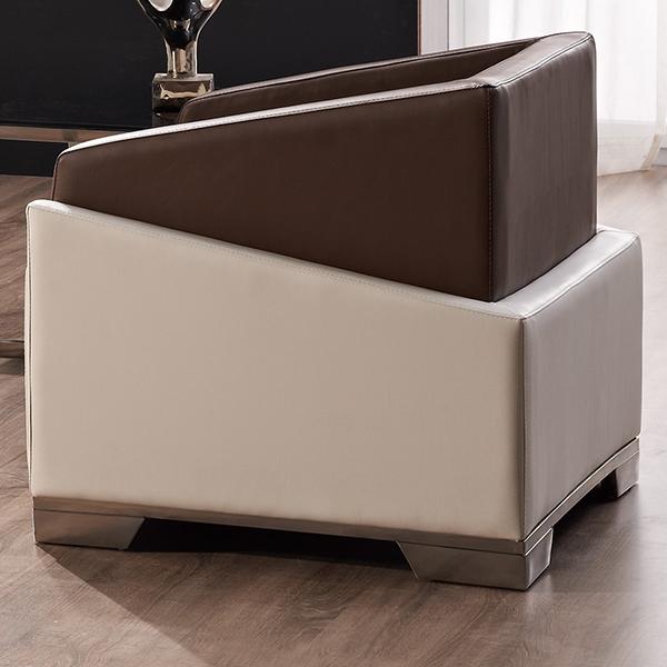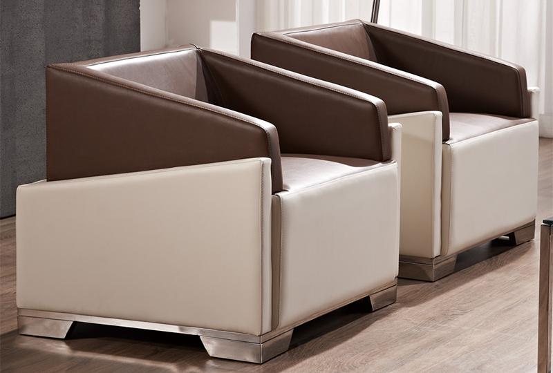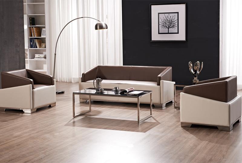 The S303 modern office leather couch has unique appearance. The upper part of the sofa such as the armrest and backrest adopts brown leather while the lower part such as seat cushion and chassis adopts creamy white leather. The upper part and the lower part are mixed with and embedded in each other. This couch is a kind of fashionable and novel sofa. The internal frame adopts solid wood. It is also equipped with metal feet and bottom frame. There is three optional specifications.